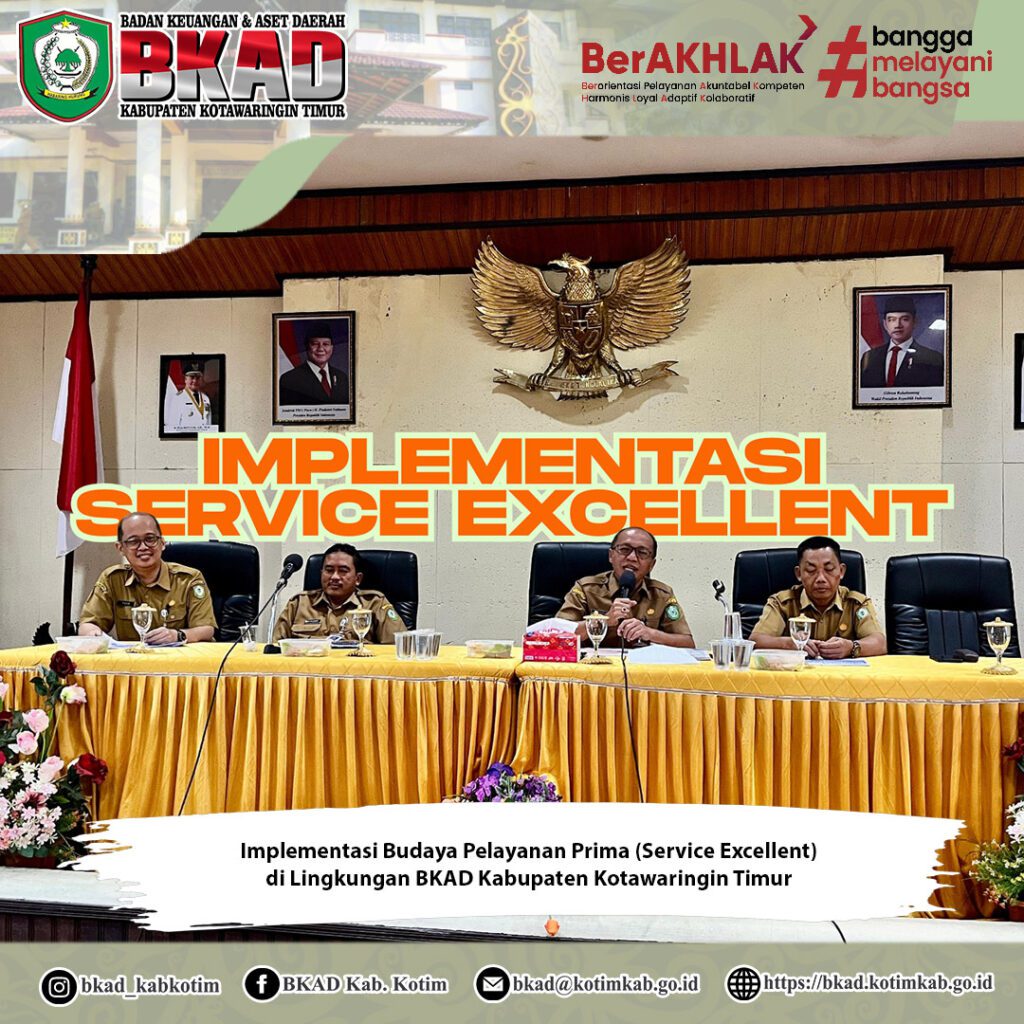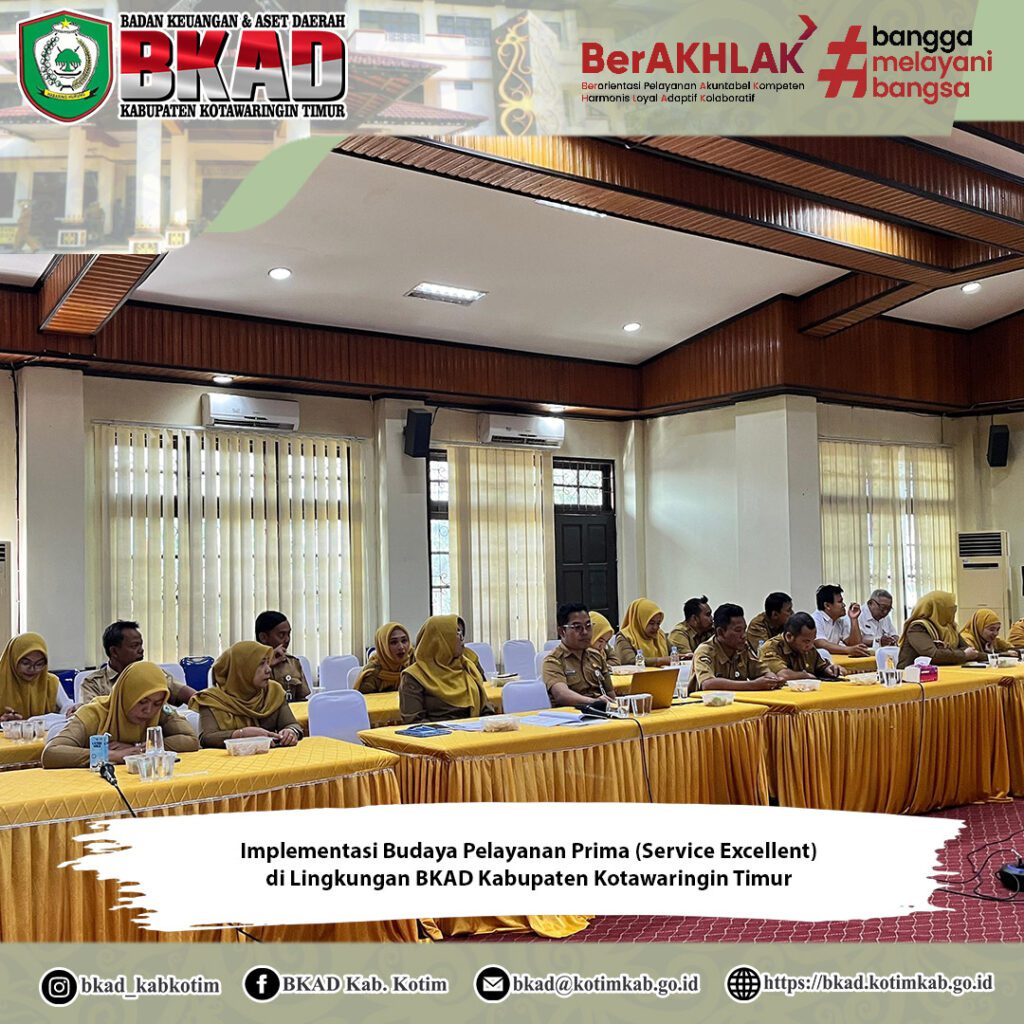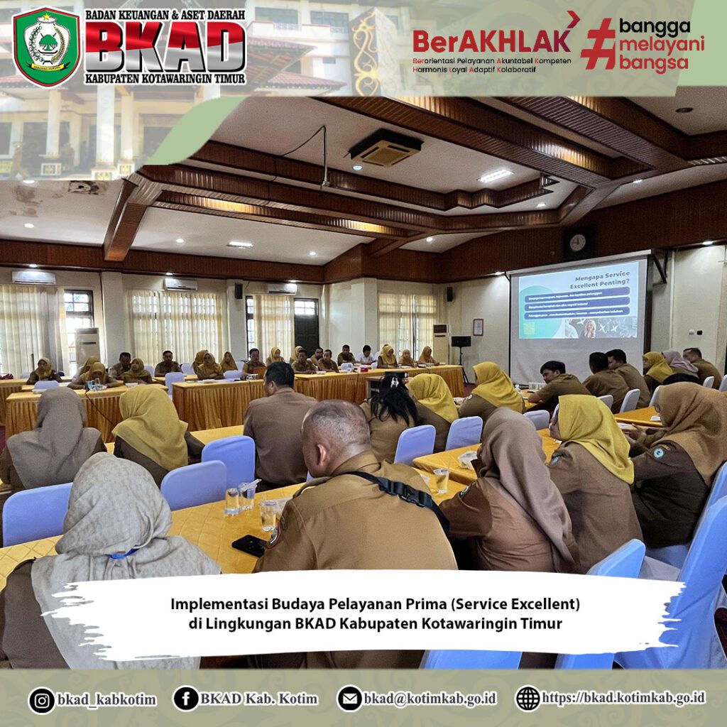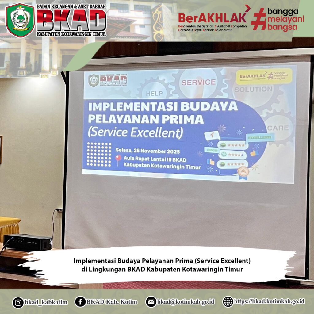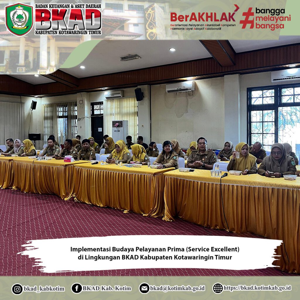 Sampit, 25 November 2025 – Badan Keuangan dan Aset Daerah (BKAD) Kabupaten Kotawaringin Timur melaksanakan Kegiatan Implementasi Budaya Pelayanan Prima (Service Excellent) yang berlangsung di Aula Rapat Lantai III BKAD.