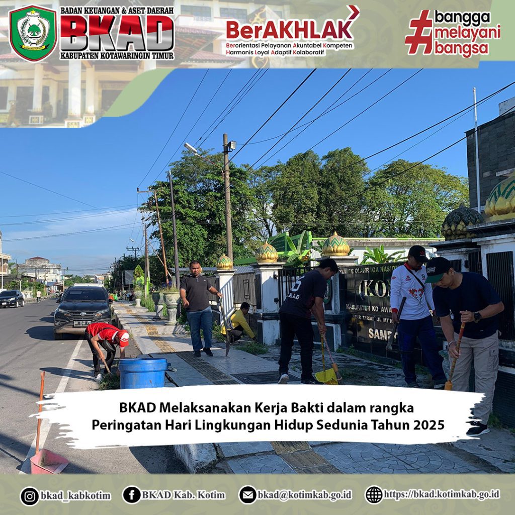 Sampit, 5 Juni 2025 – Dalam rangka memperingati Hari Lingkungan Hidup Sedunia, Badan Keuangan dan Aset Daerah (BKAD) Kabupaten Kotawaringin Timur melaksanakan kegiatan kerja bakti di jalan MT. Haryono dan sekitarnya.