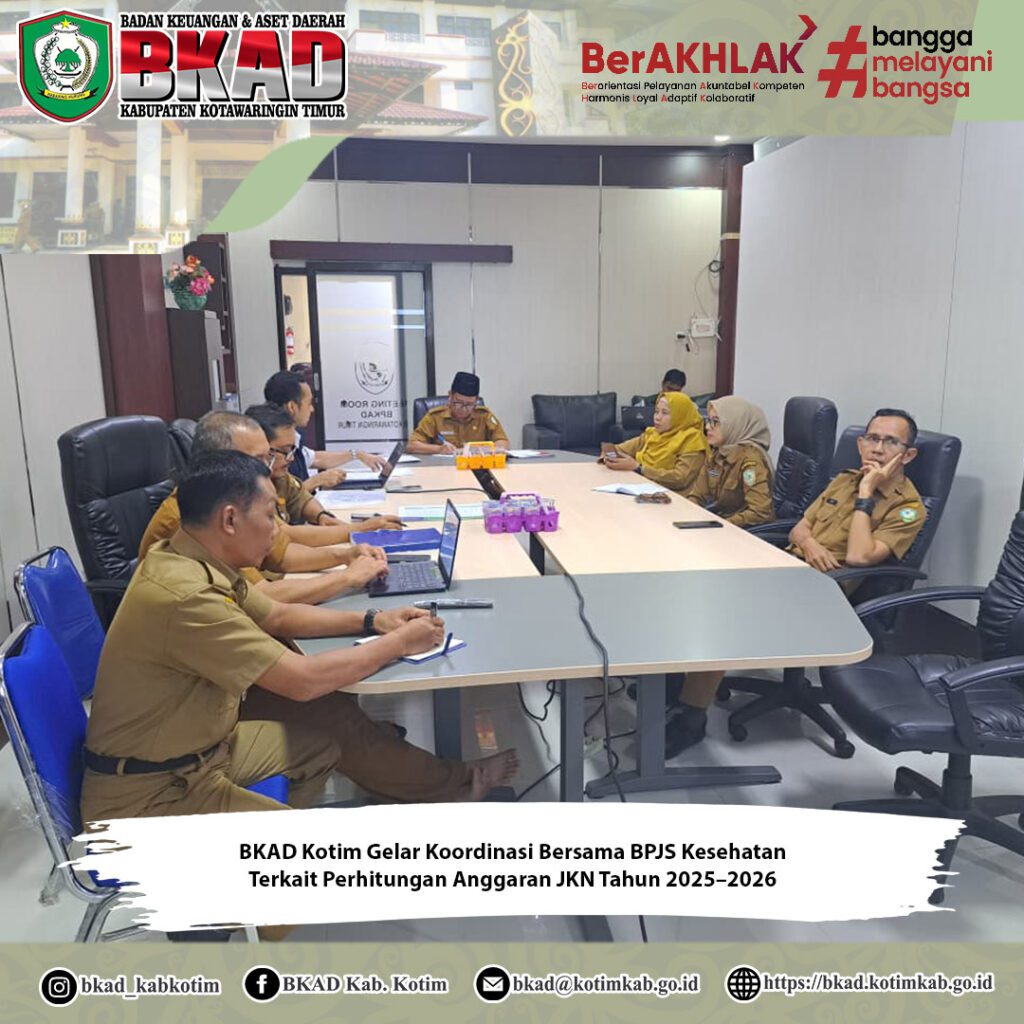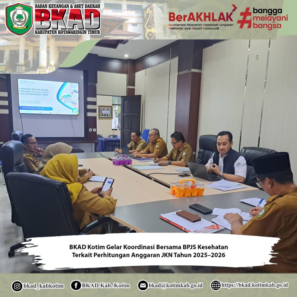 Sampit, 8 Desember 2025 – Badan Keuangan dan Aset Daerah (BKAD) Kabupaten Kotawaringin Timur melaksanakan kegiatan koordinasi bersama BPJS Kesehatan terkait perhitungan Anggaran Jaminan Kesehatan Nasional (JKN) Tahun 2025 dan 2026, yang berlangsung di Aula Rapat Lantai II Meeting Room BKAD. Kegiatan ini digelar sebagai langkah strategis pemerintah daerah dalam memastikan keakuratan perencanaan serta pengalokasian anggaran JKN bagi masyarakat Kabupaten Kotawaringin Timur.