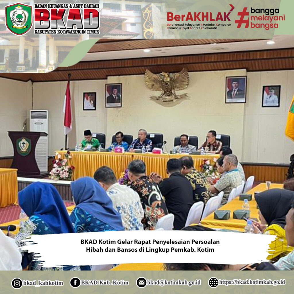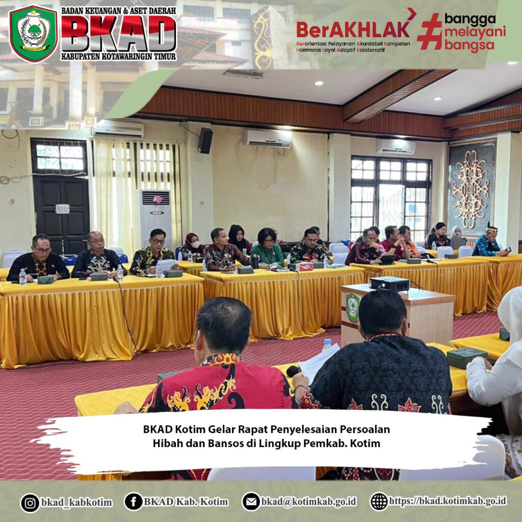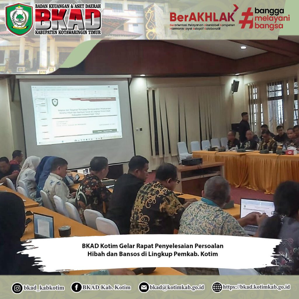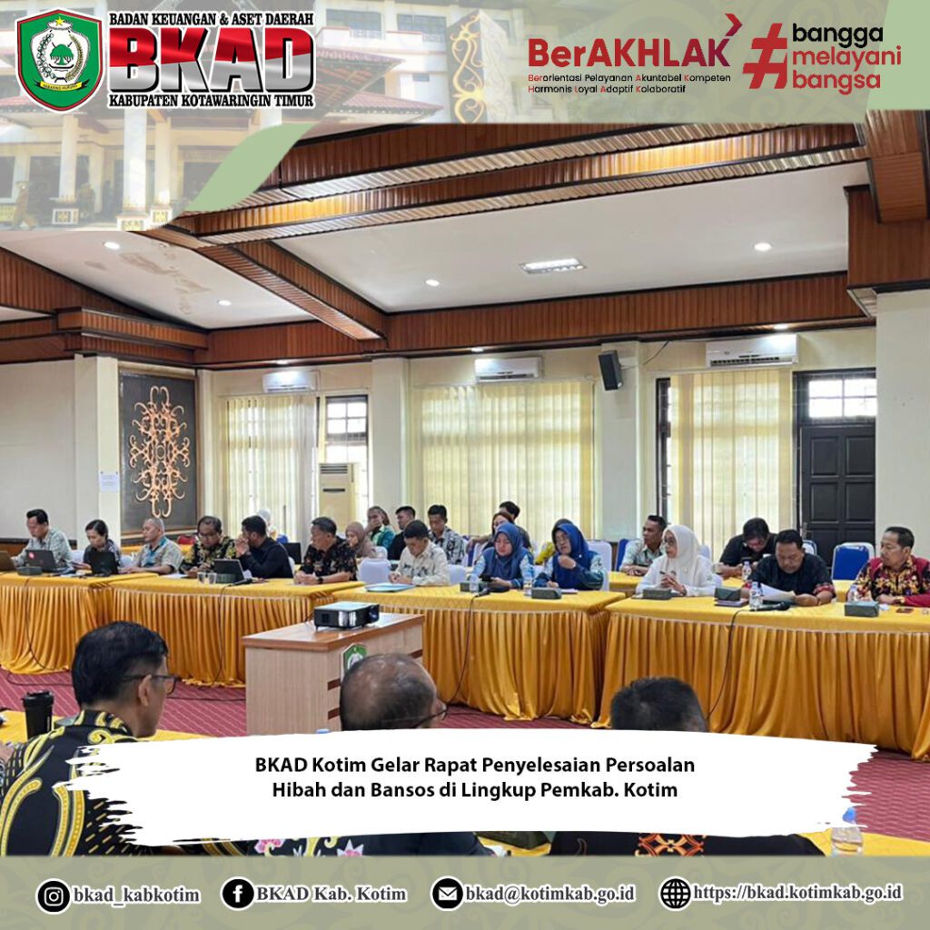 Sampit, 27 November 2025 – Badan Keuangan dan Aset Daerah (BKAD) Kabupaten Kotawaringin Timur menggelar rapat koordinasi dalam upaya menyelesaikan berbagai persoalan terkait pelaksanaan perencanaan dan penganggaran belanja hibah serta belanja bantuan sosial di lingkungan Pemerintah Kabupaten Kotawaringin Timur. Kegiatan ini dilaksanakan pada Kamis, 27 November 2025 di Aula Rapat Lantai III BKAD.