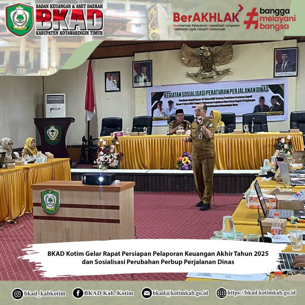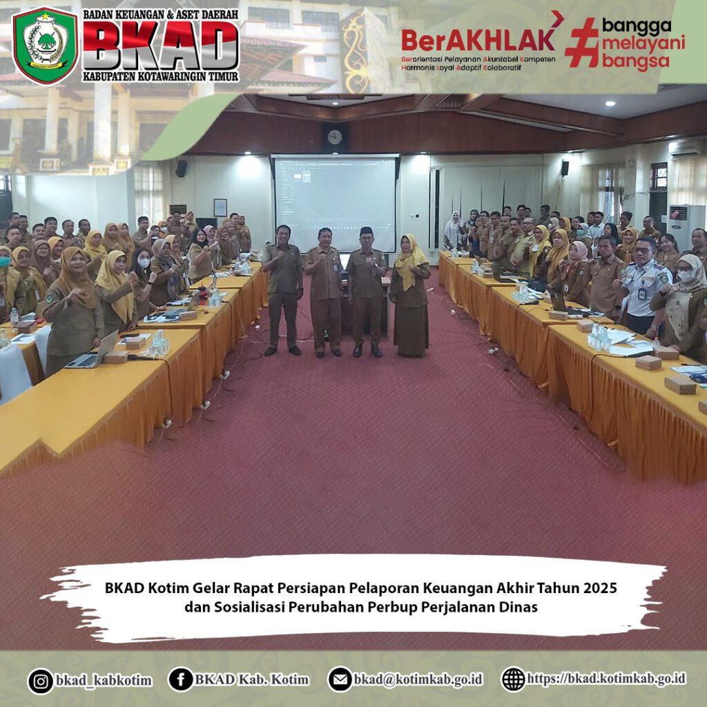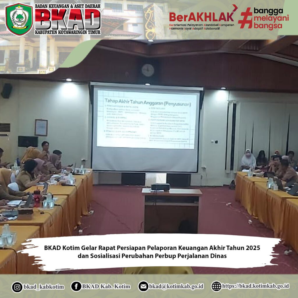 Sampit, 16 Desember 2025 – Badan Keuangan dan Aset Daerah (BKAD) Kabupaten Kotawaringin Timur melaksanakan Rapat Persiapan Penyusunan Pelaporan Keuangan Akhir Tahun 2025 yang dirangkaikan dengan Sosialisasi Peraturan Bupati Kotawaringin Timur Nomor 43 Tahun 2025 tentang Perubahan atas Peraturan Bupati Nomor 6 Tahun 2024 mengenai Pelaksanaan Perjalanan Dinas Dalam Negeri di Lingkungan Pemerintah Daerah Kabupaten Kotawaringin Timur. Kegiatan ini dilaksanakan di Aula Rapat Lantai III BKAD Kabupaten Kotawaringin Timur.