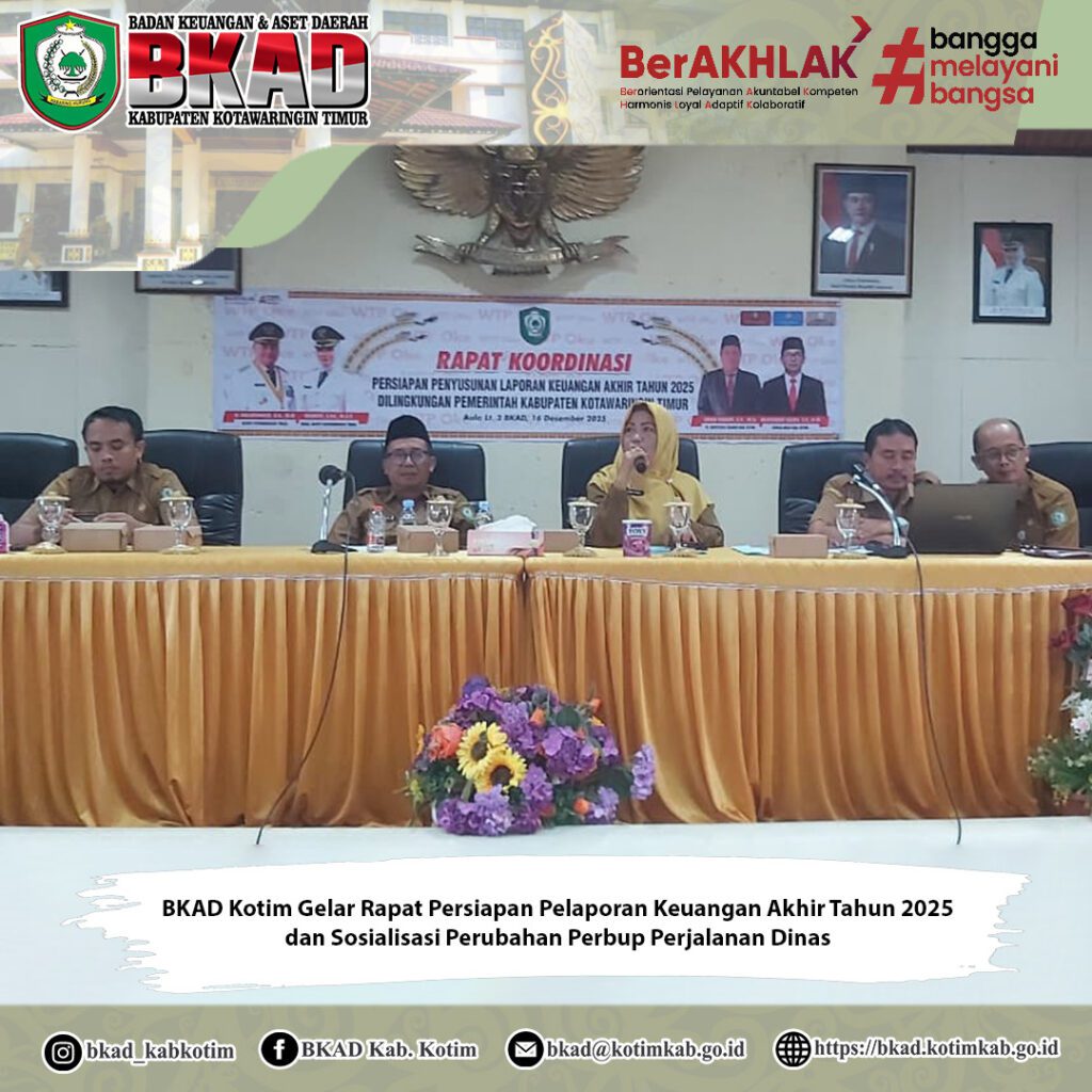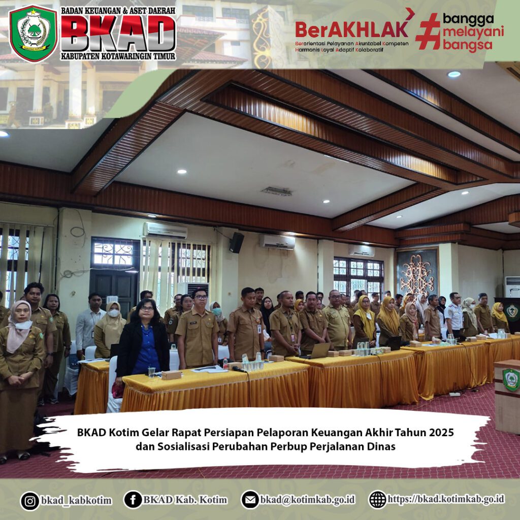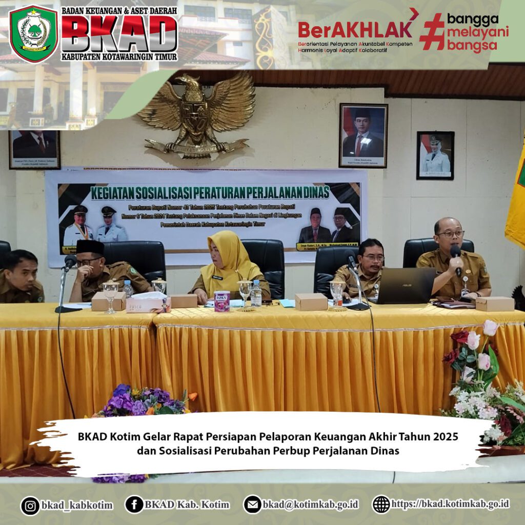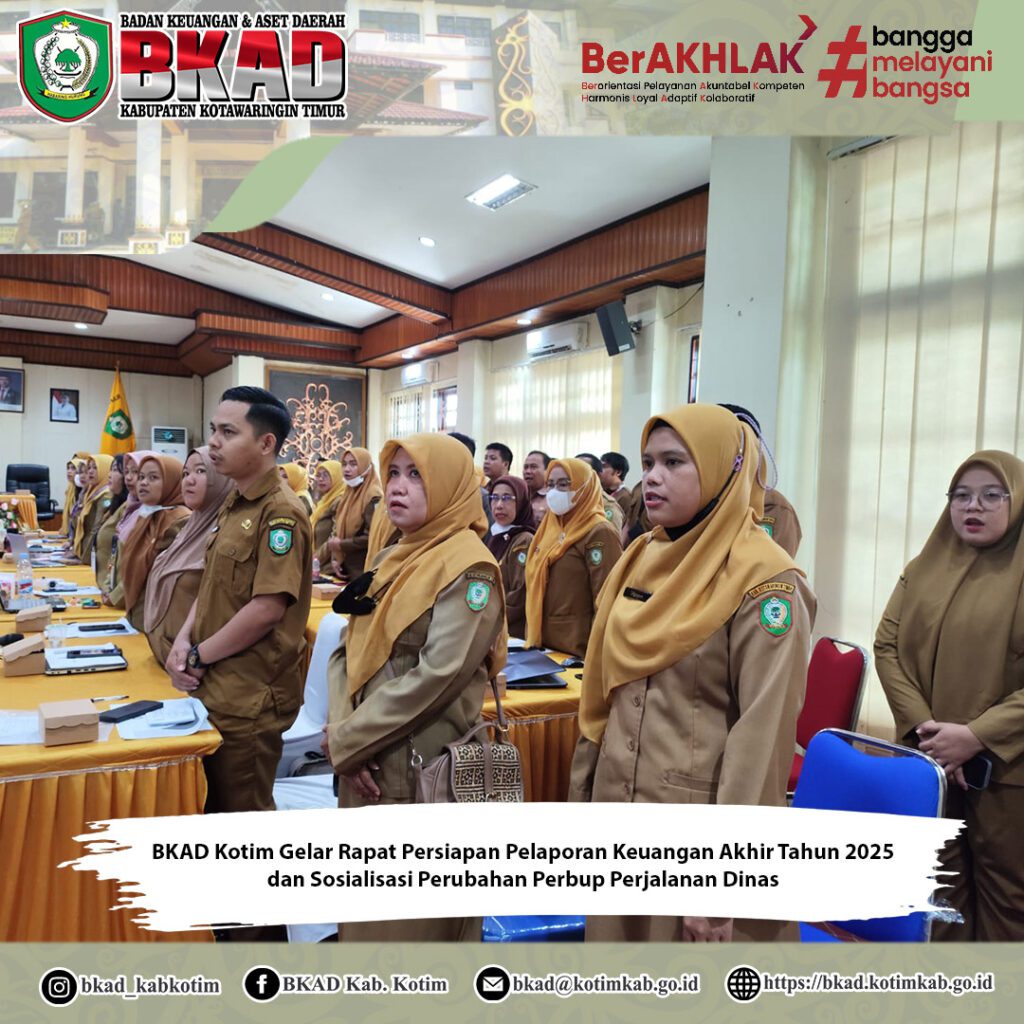 Sampit, 16 Desember 2025 – Badan Keuangan dan Aset Daerah (BKAD) Kabupaten Kotawaringin Timur melaksanakan Rapat Persiapan Penyusunan Pelaporan Keuangan Akhir Tahun 2025 yang dirangkaikan dengan Sosialisasi Peraturan Bupati Kotawaringin Timur Nomor 43 Tahun 2025 tentang Perubahan atas Peraturan Bupati Nomor 6 Tahun 2024 mengenai Pelaksanaan Perjalanan Dinas Dalam Negeri di Lingkungan Pemerintah Daerah Kabupaten Kotawaringin Timur. Kegiatan ini dilaksanakan di Aula Rapat Lantai III BKAD Kabupaten Kotawaringin Timur.