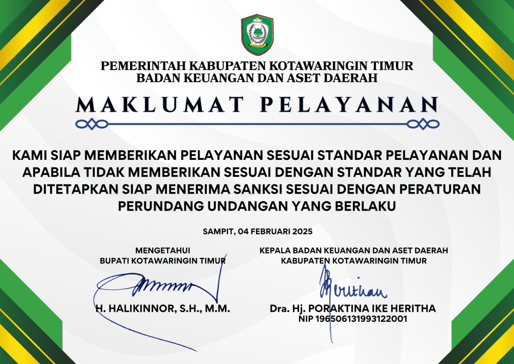 Sebagai bentuk komitmen terhadap peningkatan kualitas pelayanan publik, Badan Keuangan dan Aset Daerah (BKAD) Kabupaten Kotawaringin Timur telah menetapkan Standar Pelayanan yang menjadi pedoman dalam penyelenggaraan pelayanan di lingkungan BKAD.