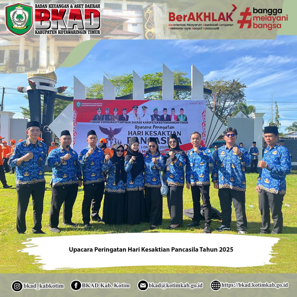 Selasa, 1 Oktober 2025, – 10 ASN dari Badan Keuangan dan Aset Daerah (BKAD) Kabupaten Kotawaringin Timur mengikuti Upacara Peringatan Hari Kesaktian Pancasila Tahun 2025 di Halaman Kantor Bupati Kotawaringin Timur.