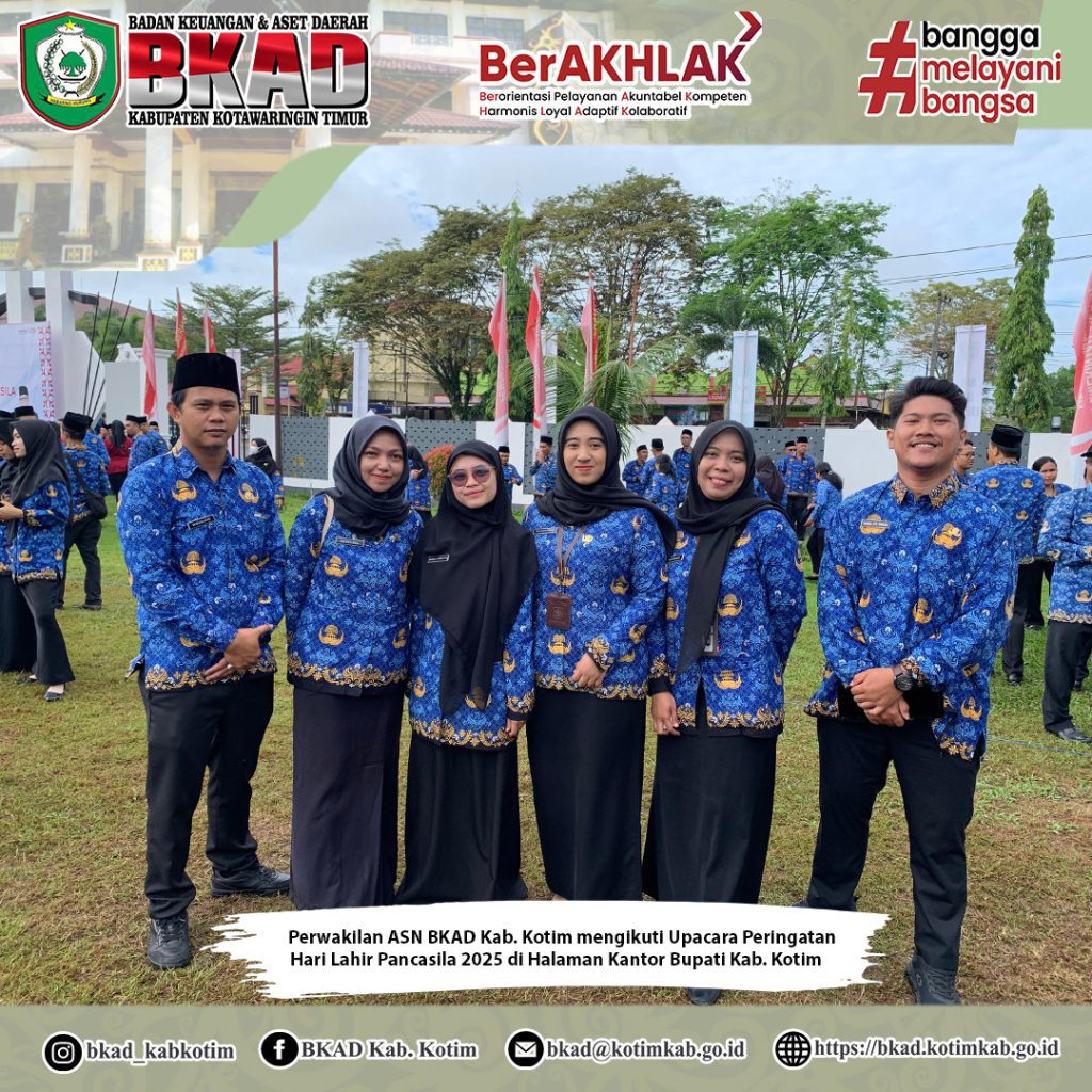 Sampit, 2 Juni 2025 – Dalam rangka memperingati Hari Lahir Pancasila yang jatuh pada tanggal 1 Juni 2025, perwakilan Aparatur Sipil Negara (ASN) dari Badan Keuangan dan Aset Daerah (BKAD) Kabupaten Kotawaringin Timur turut serta mengikuti upacara yang dilaksanakan di Halaman Kantor Bupati Kabupaten Kotawaringin Timur.